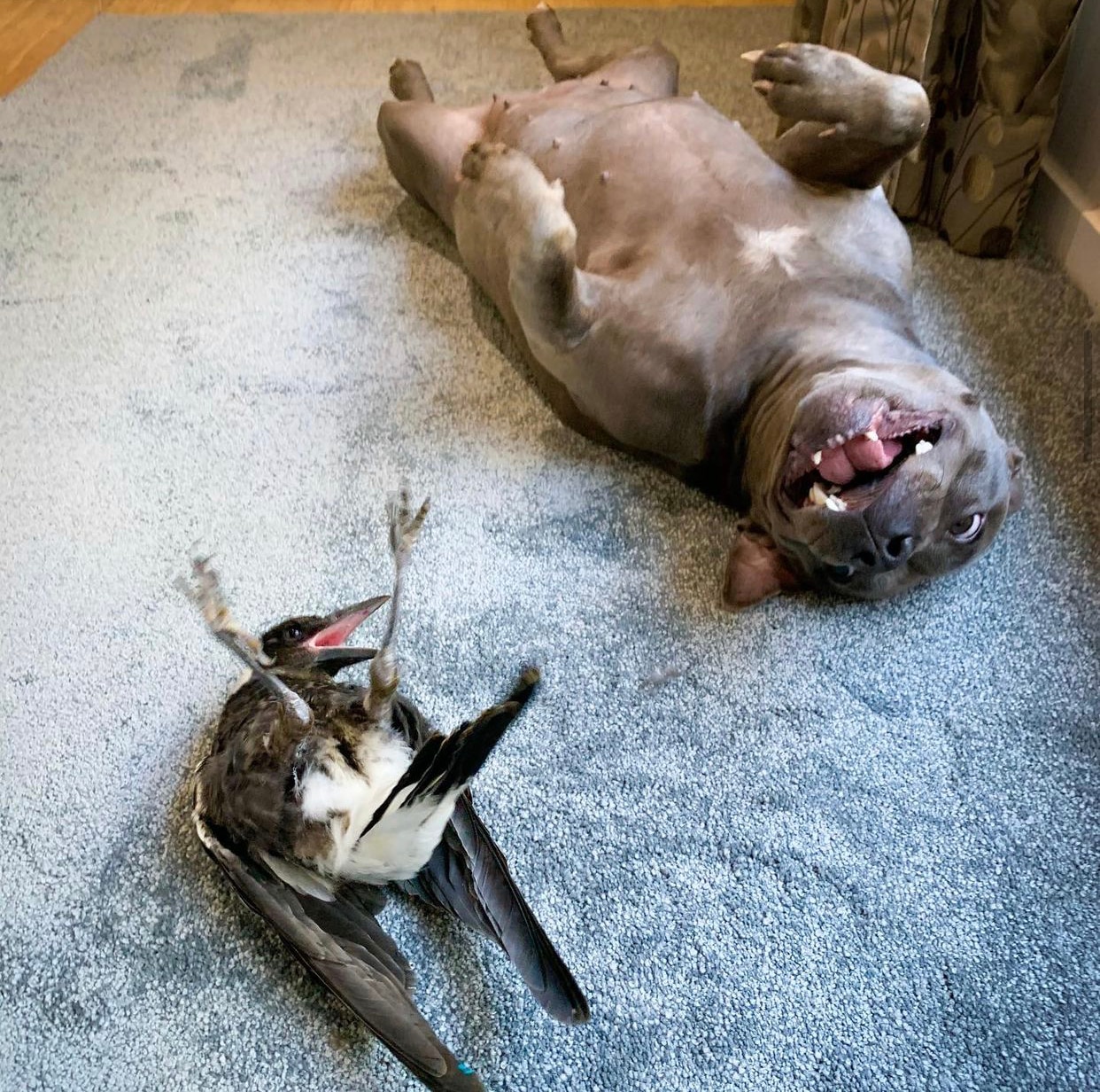 Peggy the English Staffy and Molly the magpie's "human mother" Juliette Wells believes the pair's unlikely bond is as rare as a maggie's teeth.